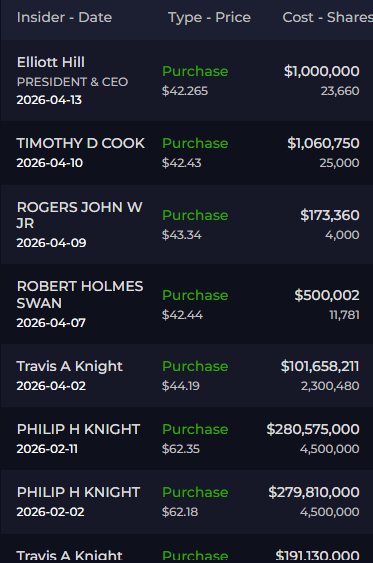 π Insider Spotlight: Tim Cook & Elliott Hill in Nike The week's most important insider signal wasn't a hedge fund filing or a CEO dumping shares ahead of bad news β it was a coordinated double-buy in a beaten-down blue chip. Apple CEO Tim Cook purchased 25,000 shares at $42.43 on April 10, while Nike CEO Elliott Hill added 23,660 shares at $42.27 on April 13 β combined, over $2 million in open-market purchases at a stock trading near 9-year lows. Cook now holds 130,480 shares worth roughly $5.7 million at current prices. He's been on Nike's board for two decades and has bought near lows before. The fact that the CEO made a near-identical move within 72 hours of a board member's purchase β during the same trading window after earnings β suggests this wasn't coincidental. It's coordinated conviction. Whether the turnaround is three months away or twelve, these two men just told you they believe the bottom is in.