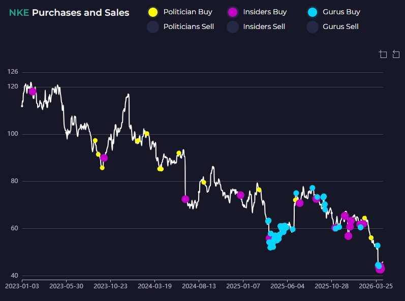π Nike's Insiders Speak with Their Wallets On April 10, Apple CEO Tim Cook purchased 25,000 shares of Nike at $42.43 per share β spending over $1 million near the stock's 52-week low. Nike's own CEO Elliott Hill added 23,660 shares at $42.27 each on April 13. Two insiders. Two purchases within three days. Both near the bottom. The stock is trading at multi-year lows, hammered by tariff pressures squeezing gross margins to 40.2% and a 7% decline in Greater China revenue during Q3. Cook has been a Nike board member since 2005 β he doesn't buy stock near 9-year lows without conviction. The CEO buying alongside a board member of that profile isn't a coincidence. It's a message.