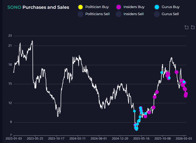 ๐ต 6. Sonos CEO Bought $1 Million of His Own Stock Sonos CEO Thomas Conrad purchased 62,325 shares for an estimated $1,008,044. The stock has been crushed โ down significantly from its highs amid a product stumble and management transition. Conrad buying this aggressively with his own capital after the stock's drawdown is not a casual signal. When a CEO puts seven figures of personal money into his own company's stock near a multi-year low, that's a statement worth noting.